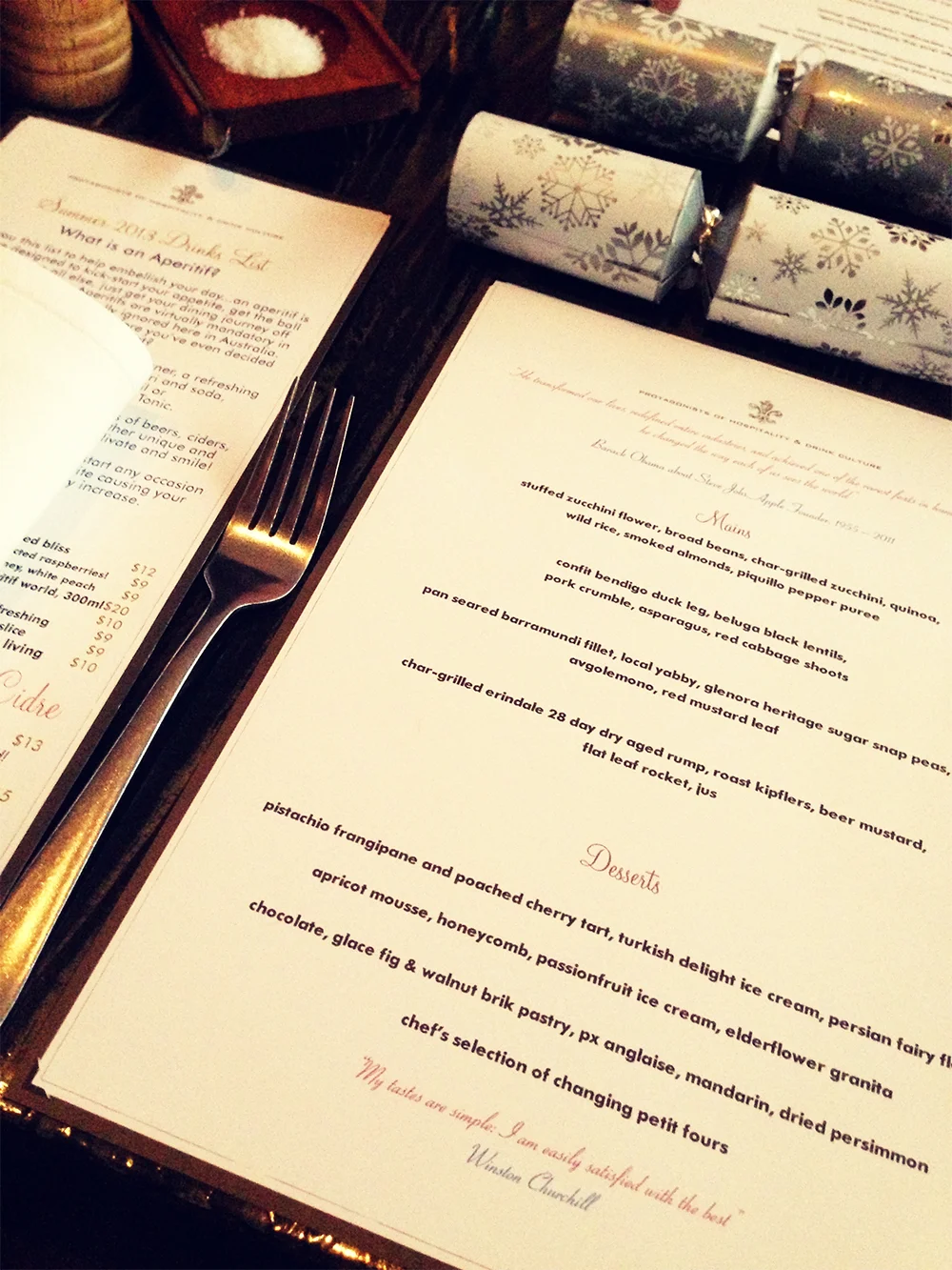 Before the lights went down, I took a photo of our menu, click through for a larger version. But, as always, check their website as Tim etc. are a creative crew, so things are constantly changing.