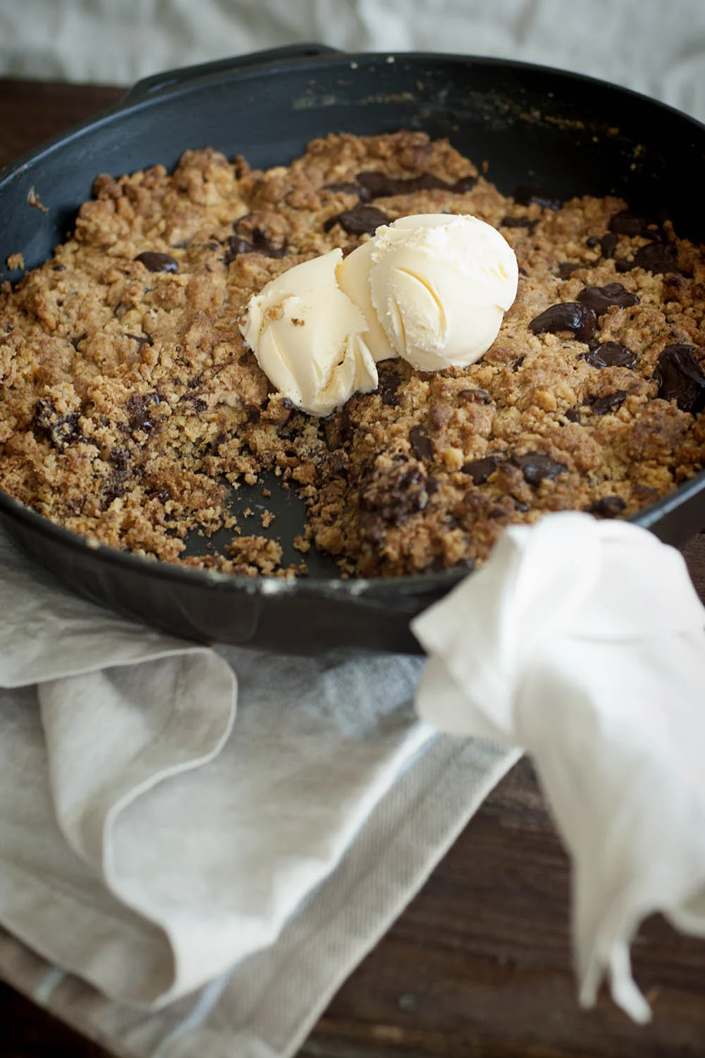 Does anyone else have an irrational fear of burning themselves on the handle of a cast iron fry pan like this? I ended up buying myself a fabric pot holder and sewing the edges together to make a little cover for the handle...because you need two hands to lift this thing...and one day I just know I'm going to forget it was just in the oven and grab the raw cast iron handle. I've done it with Pyrex straight out of the oven before, so it's only a matter of time! Anyway, I digress. This one is by Chasseur...you can find the red version here. ...it's the less expensive cousin to the original Le Creuset. Just remember if you're serving it up in the pan at the table, you don't want people digging in with their spoons and scratching the surface of these ones! I used a silicone spatula to separate out some chunks ready for serving. Dollop vanilla ice cream on top and let it melt with the warmth of the crumbling cookie :)
