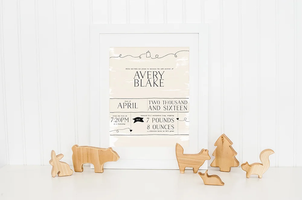 With hand drawn details, and a paint washed background...the crispness of this neutral/black/white print will blend into any nursery decor. A little bit Scandi, a little bit Vintage Playbill Poster...tweaked by me to celebrate the arrival of a little one :)