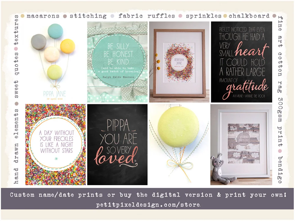 So I wanted to be part of creating something personalised especially for you...and that's how the idea of Petit Pixel Design came to be. Whether it be a framed print in the nursery of your newest little arrival...or a keepsake framed on the gift table at your wedding. Maybe a first anniversary present (it is made of paper after all!)...or a housewarming/hostess gift. I believe you can't underestimate the feeling of seeing your own name in print...especially when it comes to little ones...even more-so with the unique spelling of names being more popular then ever.